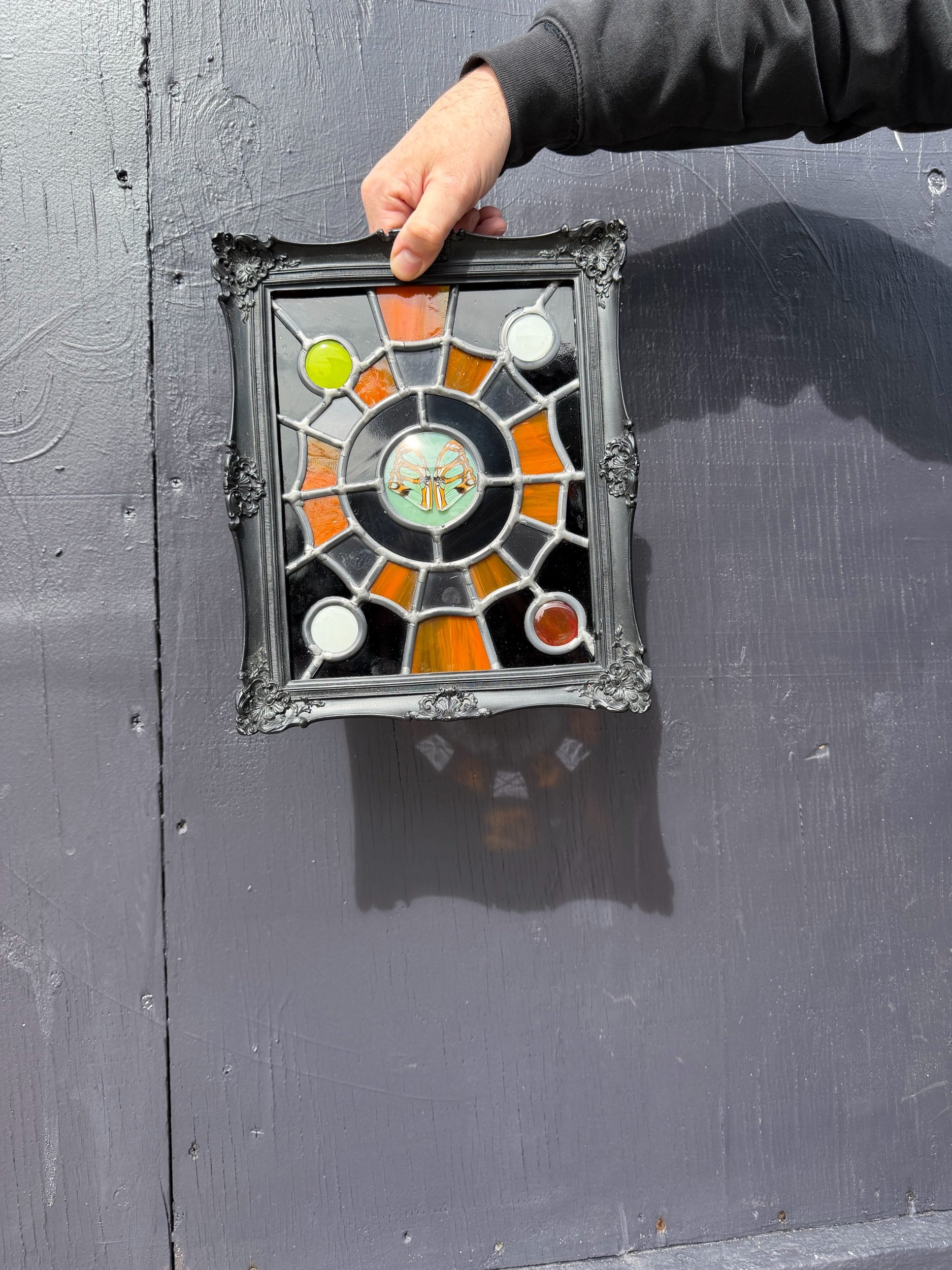 Image 1 of 3 Image 2 of 3 Image 3 of 3 Framed Stained Glass Spiderweb Panel with Mounted Butterfly Wings $250.00 Stained glass framed panel featuring a set of preserved butterfly wings and hand made cabochons. Hand made and unique Add To Cart Added! Stained glass framed panel featuring a set of preserved butterfly wings and hand made cabochons. Hand made and unique
